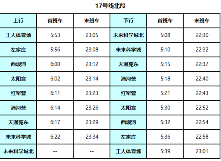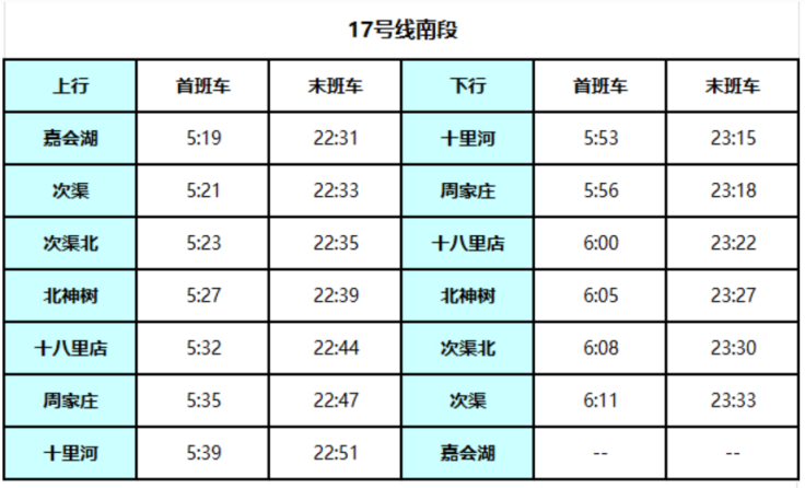 随着17号线启动贯通按图试运行,各站首末班车时间也有所调整,其中,17号线南段嘉会湖站至十里河站各站,首班车发车时间最多提前了12分钟,末班车发车时间最多延后了47分钟;17号线北段工人体育场站至未来科学城北站各站,首班车发车时间最多提前了12分钟,末班车发车时间最多延后了8分钟;17号线南段和北段全天运营时间增长,让地铁出行更加灵活、便民。
